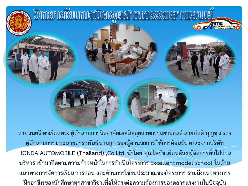 นายมนตรี หาเรือนทรง ผู้อำนวยการวิทยาลัยเทคนิคอุตสาหกรรมยานยนต์ นายสันติ บุญชุ่ม รองผู้อำนวยการ และนายอรรถพันธ์ นามกูล รองผู้อำนวยการ ให้การต้อนรับ คณะจากบริษัท HONDA AUTOMOBILE (Thailand).,Co.Ltd. นำโดย คุณไพรัช เผื่อนด้วง ผู้จัดการทั่วไปส่วนบริหาร เข้ามาติดตามความก้าวหน้าในการดำเนินโครงการ Excellent model school ในด้านแนวทางการจัดการเรียน การสอน และด้านการใช้งบประมาณของโครงการ รวมถึงแนวทางการฝึกอาชีพของนักศึกษาทุกสาขาวิชาเพื่อให้ตรงต่อความต้องการของตลาดแรงงานในปัจจุบัน