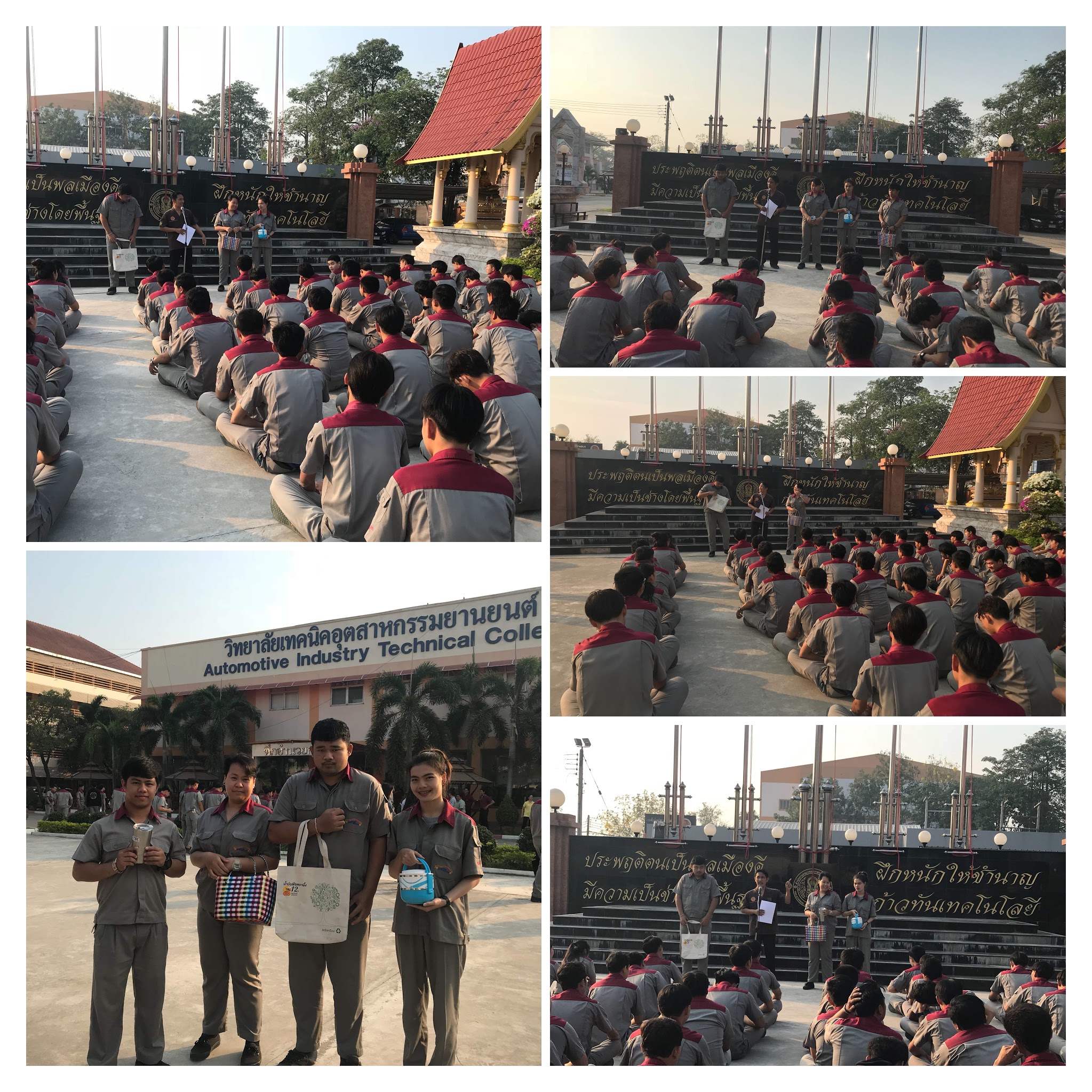 วันที่ 12 กุมภาพันธ์ 2563 นายพิเนตร ธาระมัต หัวหน้างานกิจกรรมนักศึกษา และเจ้าหน้าที่ ร่วมจัดกิจกรรม ส่งเสริมและสนับสนุนการใช้แก้วน้ำส่วนตัว ตะกร้า ถุงผ้า และปิ่นโตหรือภาชนะที่เป็นมิตรต่อสิ่งแวดล้อม เพื่อลดการใช้แก้วน้ำพลาสติก ถุงพลาสติกหูหิ้ว และโฟมบรรจุอาหาร ภายในสถานศึกษา ณ วิทยาลัยเทคนิคอุตสาหกรรมยานยนต์