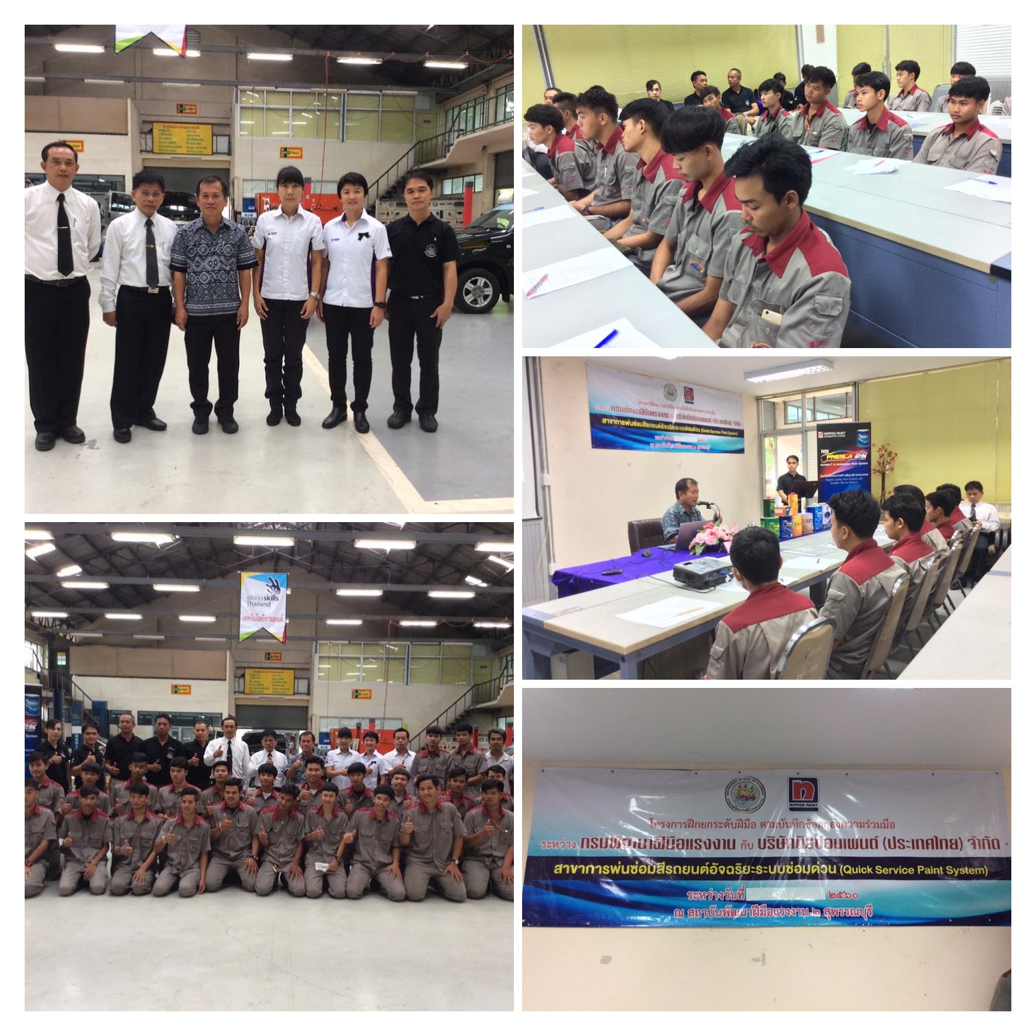 นายมนตรี หาเรือนทรง ผู้อำนวยการวิทยาลัยเทคนิคอุตสาหกรรมยานยนต์ นายอรรถพันธ์ นามกูล รองฯฝ่ายวิชาการ นายสิทธิชัย ชำนาญ หัวหน้าสาขาวิชาเทคโนโลยีตัวถังและสีรถยนต์และนายณรงค์ศักดิ์ พันธุ์คง ครูฯ ร่วมพิธีเปิดการฝึกอบรมโครงการฝึกยกระดับฝีมือ สาขาการพ่นซ่อมสีรถยนต์อัจฉริยะระบบซ่อมสีด่วน (Quick Service Paint System) ร่วมกับสถาบันพัฒนาฝีมืแรงงานภาค2 สุพรรณบุรี โดยมีนายมงคล ลีลาธนากร ผู้อำนวยการสถาบัน ฯ เป็นประธาน คณะวิทยากรจากสถาบัน ฯ นำโดยนายกษิดิจ ทับทิม หัวหน้าฝ่ายช่างยนต์ และคณะวิทยากรจาก บ.Nippon Paint (ประเทศไทย) จำกัด นำทีมโดยคุณคมคาย ธมะสุข ผจก.ฝ่ายทรัพยากรบุคคลและบริหาร พร้อมกับคุณสมสุข มิ่งขวัญโพธิ์ทอง ผจก.ฝ่ายอบรมด้านเทคนิค