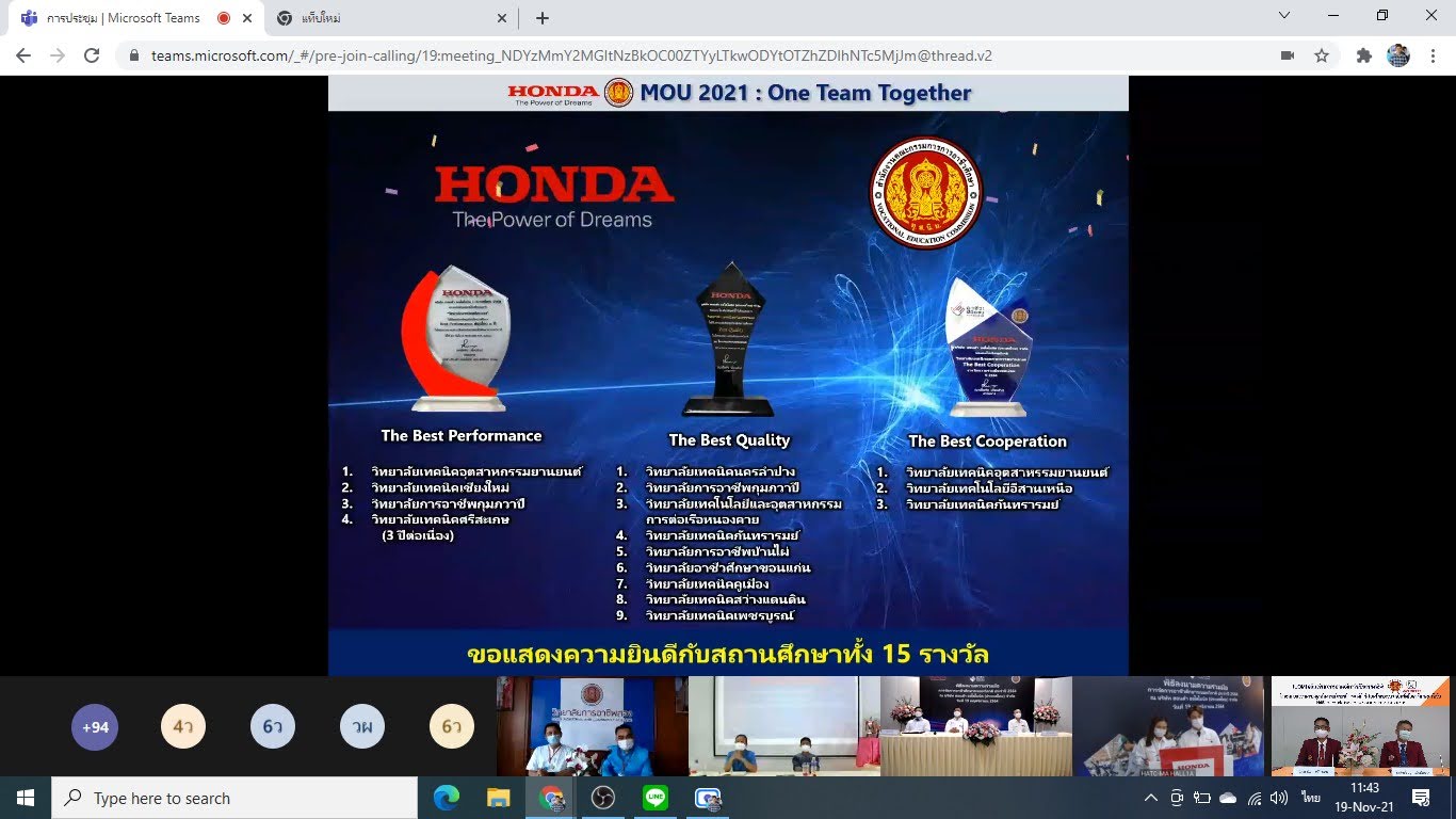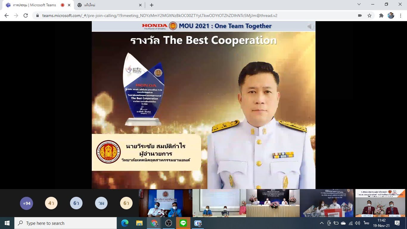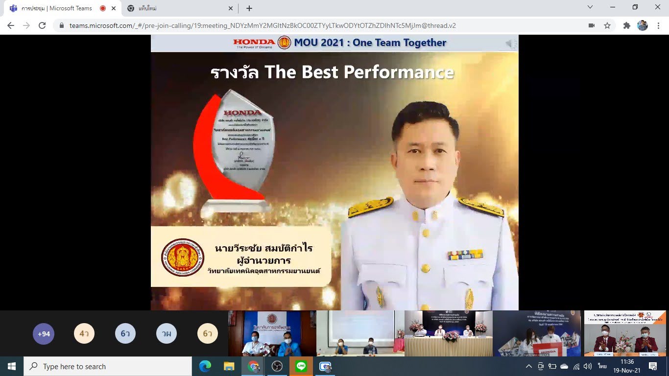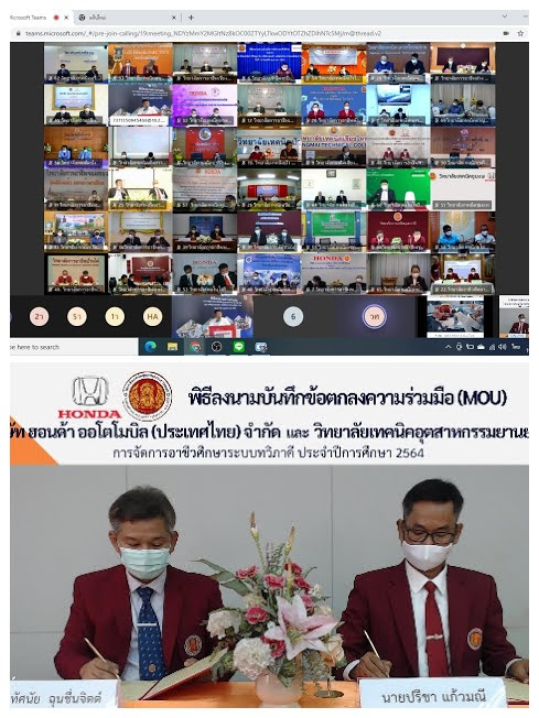 วันที่ 19 พฤศจิกายน 2564 วิทยาลัยเทคนิคอุตสาหกรรมยานยนต์ โดยนายทัศนัย ฉุนชื่นจิตต์ รองผู้อำนวยการฝ่ายวิชาการ และนายปรีชา แก้วมณี รองผู้อำนวยการบริหารฝ่ายทรัพยากร ประชุมและลงนามบันทึกข้อตกลงความร่วมมือการจัดการอาชีวศึกษาระบบทวิภาคี(MOU) ระหว่างบริษัท ฮอนด้า ออโตโมบิล (ประเทศไทย) จำกัด วิทยาลัยเทคนิคอุตสาหกรรมยานยนต์ เป็นวิทยาลัยได้รับคัดเลือกเป็นสถานศึกษาในรูปแบบทวิภาคี ที่ประสานความร่วมมือกับบริษัท ฮอนด้า ออโตโมบิล (ประเทศไทย) จำกัด ที่มีประสิทธิภาพที่ดีที่สุด