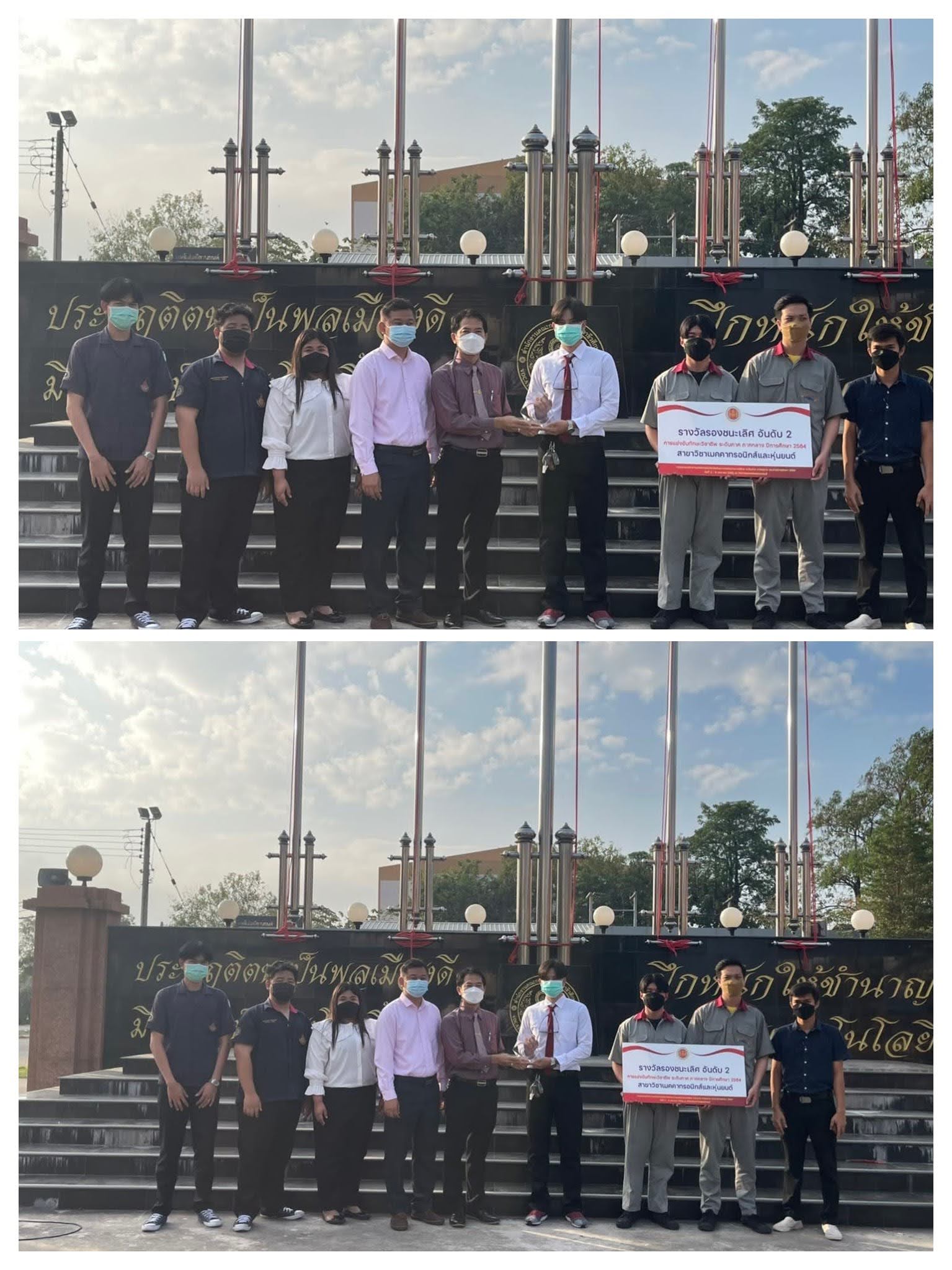 วันที่ 1 กุมภาพันธ์ 2565 นายพิเชษฐ์ หาดี ผู้อำนวยการวิทยาลัยเทคนิคอุตสาหกรรมยานยนต์ และคณะผู้บริหาร มอบรางวัลแสดงความยินดี กับคณะครูและนักศึกษา วิทยาลัยเทคนิคอุตสาหกรรมยานยนต์ ได้รับรางวัลรองชนะเลิศ อันดับ2 ในงานการแข่งขันทักษะวิชาชีพ ระดับภาค ภาคกลาง ปีการศึกษา 2564 สาขาแมคคาทรอนิคส์และหุ่นยนต์ ณ ลานกิจกรรม หน้าเสาธง วิทยาลัยเทคนิคอุตสาหกรรมยานยนต์