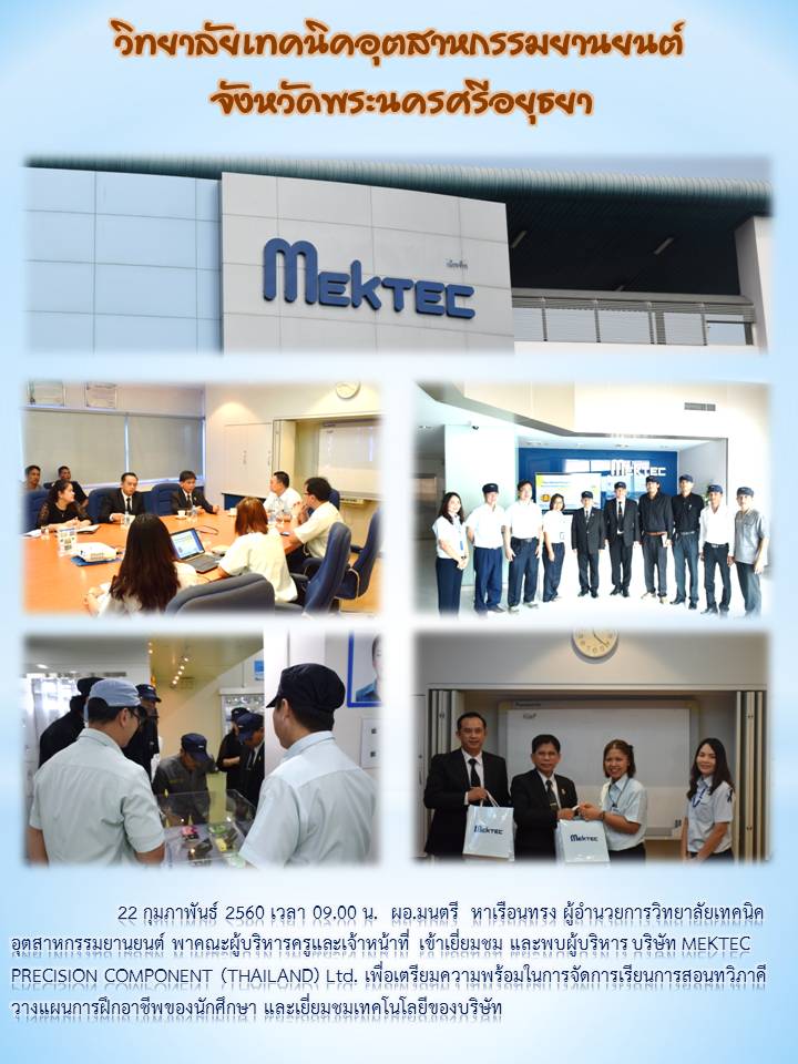 รายงานข่าว:นายมนตรี หาเรือนทรง ผู้อำนวยการวิทยาลัยเทคนิคอุตสาหกรรมยานยนต์ นายอรรถพันธ์ นามกูล รองฯฝ่ายวิชาการ พร้อมคณะครู ของวิทยาลัย เข้าเยี่ยมชมและปรึกษาในเรื่องความร่วมมือการจัดการศึกษาระบบทวิภาคี กับบริษัท Mektec Manufacturing Coporation. (Thailand) Ltd. บางปะอิน ในสาขาแมคคาทรอนิกส์และอิเล็กทรอนิกส์ ซึ่งเป็นพันธมิตรใหม่