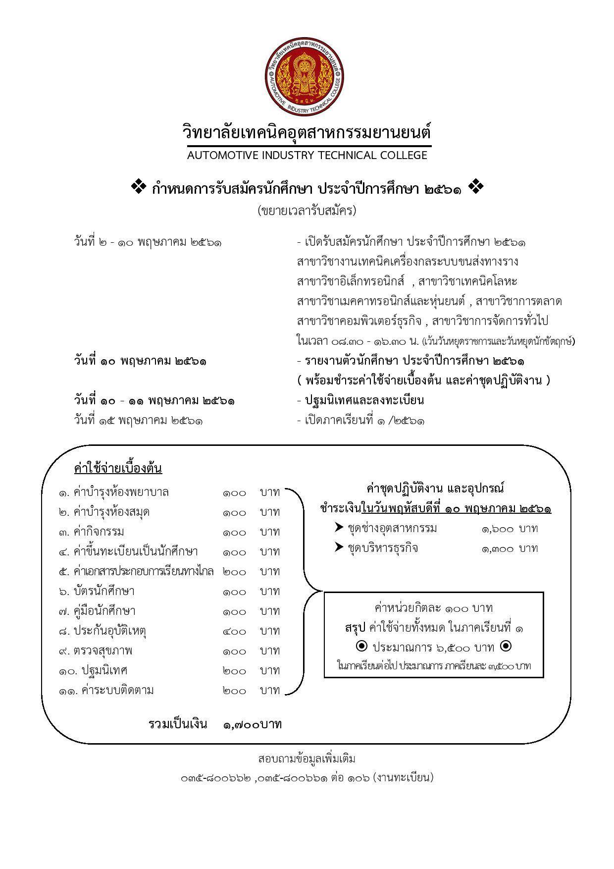 กำหนดการรับสมัครนักศึกษา(ขยายเวลา) ประจำปีการศึกษา 2561 และ ค่าใช้จ่ายเบื้องต้น กำหนดการรับสมัครนักศึกษา ประจำปีการศึกษา 2561 และ ค่าใช้จ่ายเบื้องต้น รอบขยายเวลา Prev Next