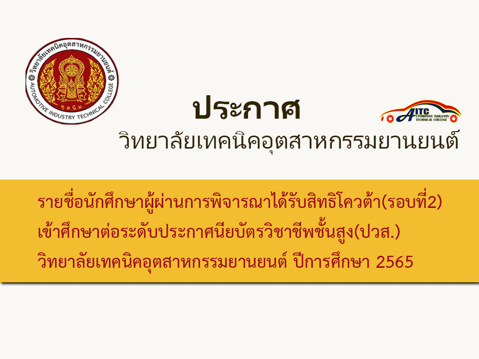 วิทยาลัยเทคนิคอุตสาหกรรมยานยนต์ ปีการศึกษา 2565 >>คลิ๊ก<<