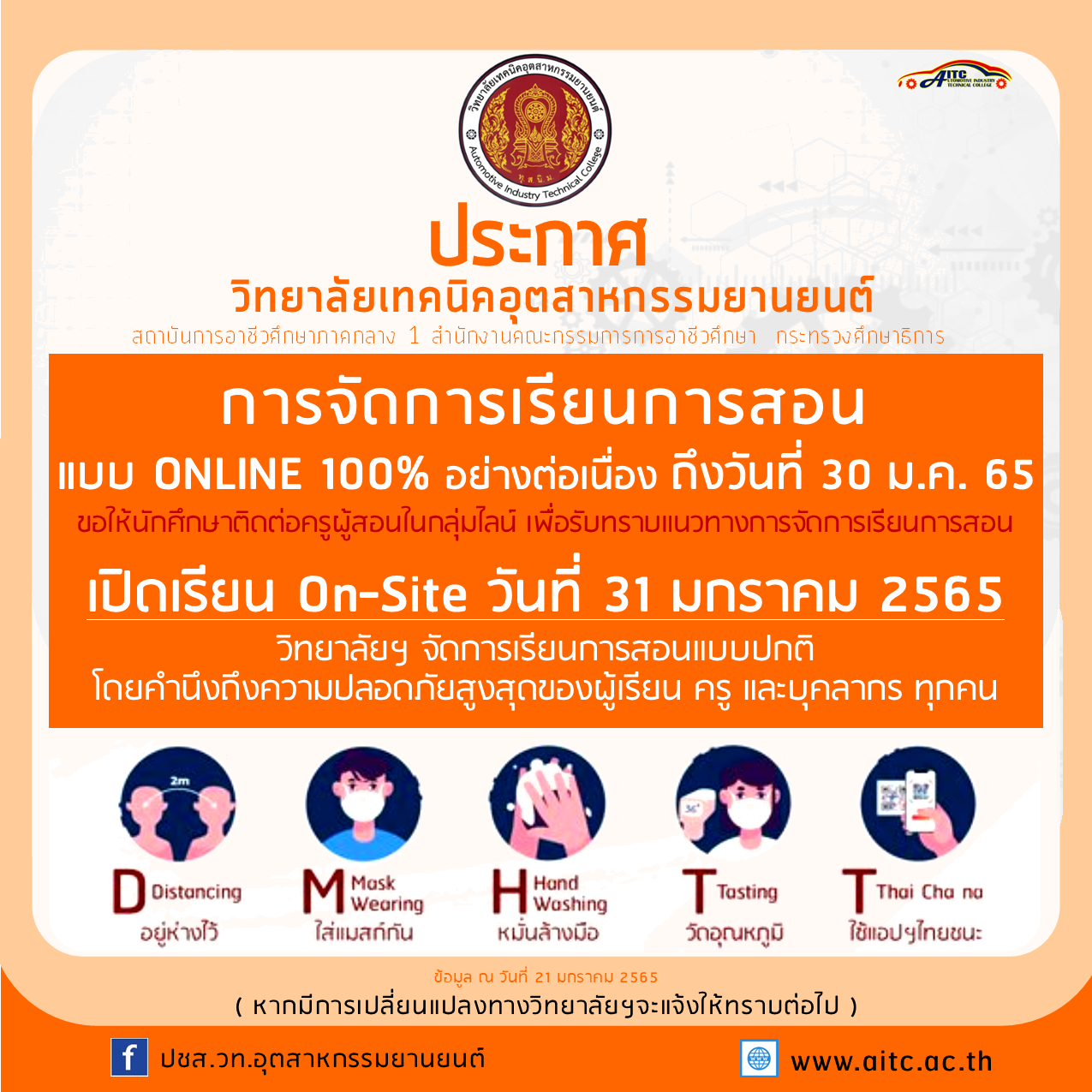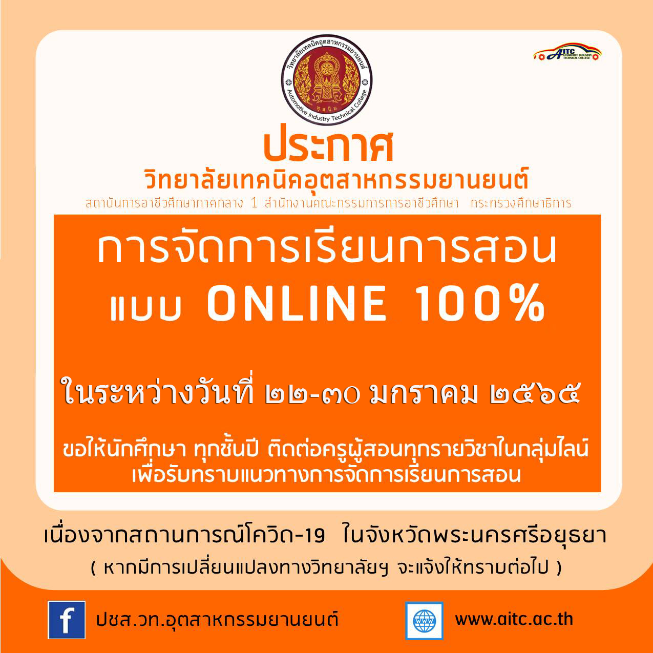 ประกาศวิทยาลัยเทคนิคอุตสาหกรรมยานยนต์ เรื่อง การจัดการเรียนการสอนแบบ ONLINE 100% อย่างต่อเนื่องถึงวันที่ 30 มกราคม 2565