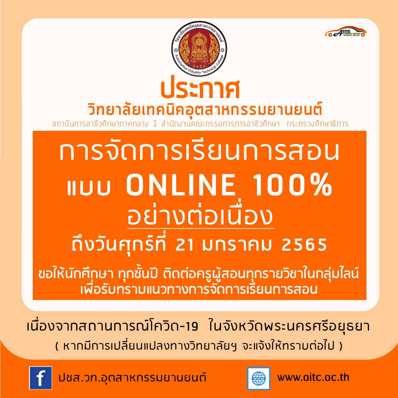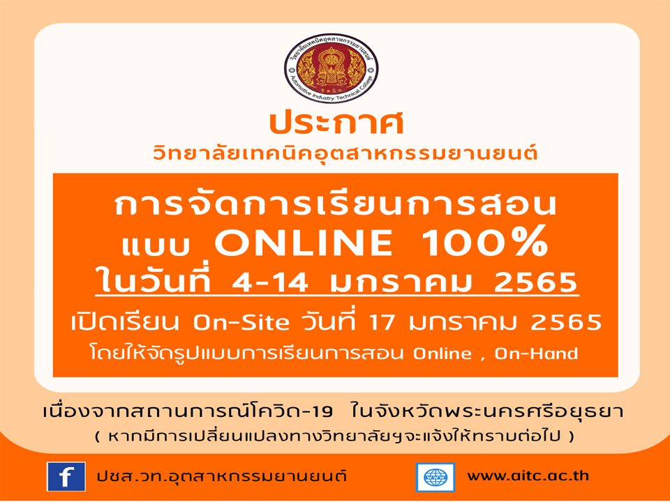 ประกาศวิทยาลัยเทคนิคอุตสาหกรรมยานยนต์ เรื่อง ขยายเวลาในการจัดการเรียนการสอนถึงวันที่ 21 มกราคม 2565 ภายใต้สถานการณ์การแพร่ระบาดของโรคติดเชื้อไวรัสโคโรนา ๒o๑๙(COVID-19)
