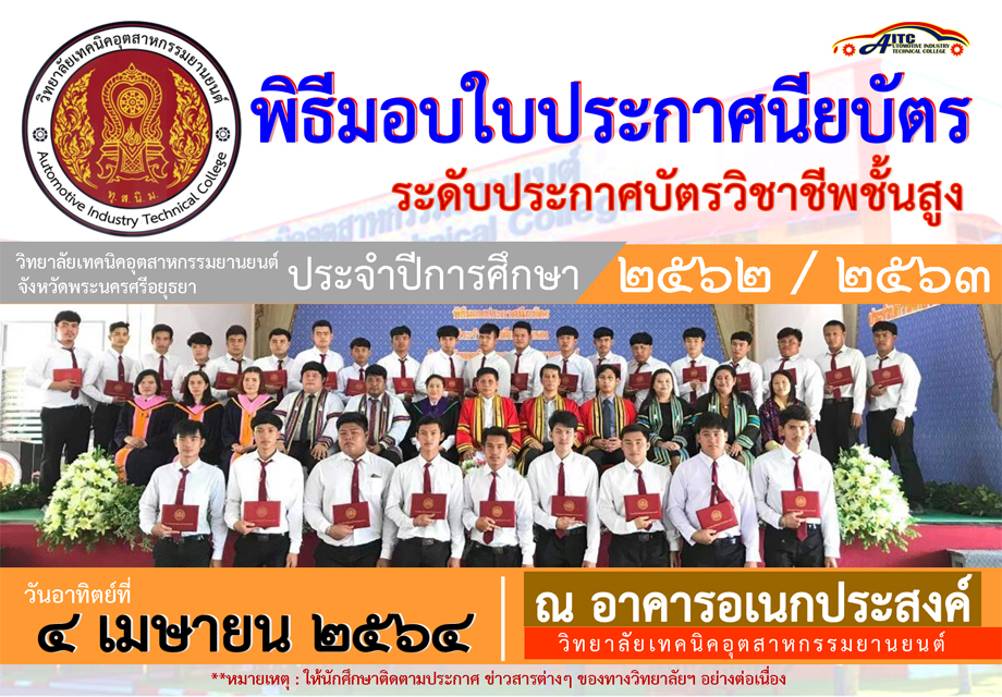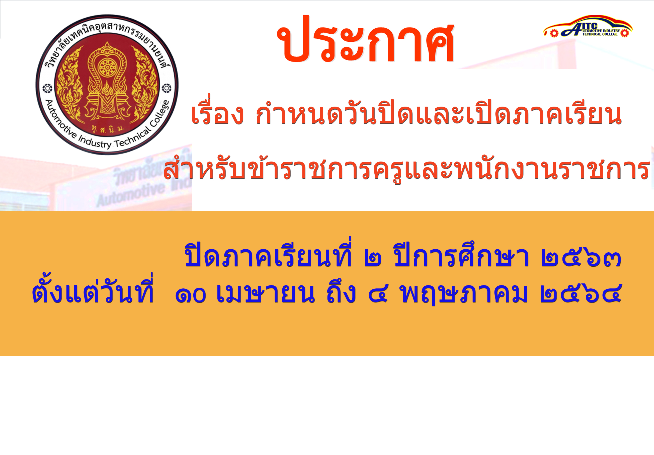 ประกาศ วิทยาลัยเทคนิคอุตสาหกรรมยานยนต์ เรื่อง กำหนดวันปิดและเปิดภาคเรียน >>คลิก<<