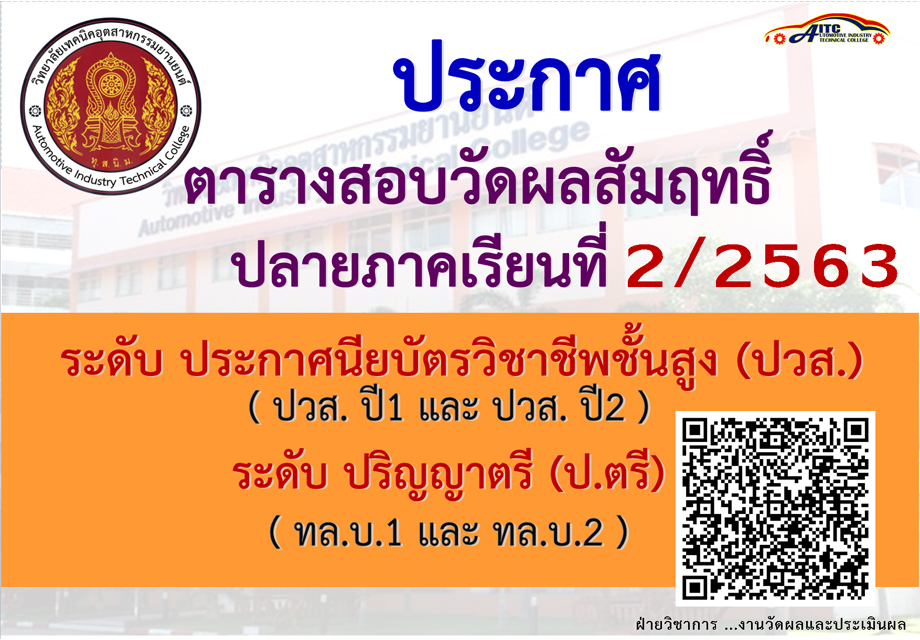 วันที่ 2 มีนาคม 2564  นายวีระชัย สมบัติกำไร  ผู้อำนวยการ วิทยาลัยเทคนิคอุตสาหกรรมยานยนต์ เป็นประธาน เปิดงานปัจฉิมนิเทศปีการศึกษา2563 พร้อมคณะผู้บริหาร  อาจารย์และเจ้าหน้าที่  ในงานได้รับเกียรติจาก JOBTOPGUN   และ SUPER RESUME  วิทยากรบรรยายให้ความรู้ในงาน โดยมีนักศึกษา  ที่กำลังจะสำเร็จการศึกษาเข้าร่วมกิจกรรม  ณ ห้องประชุมยานยนต์ 2 วิทยาลัยเทคนิคอุตสาหกรรมยานยนต์