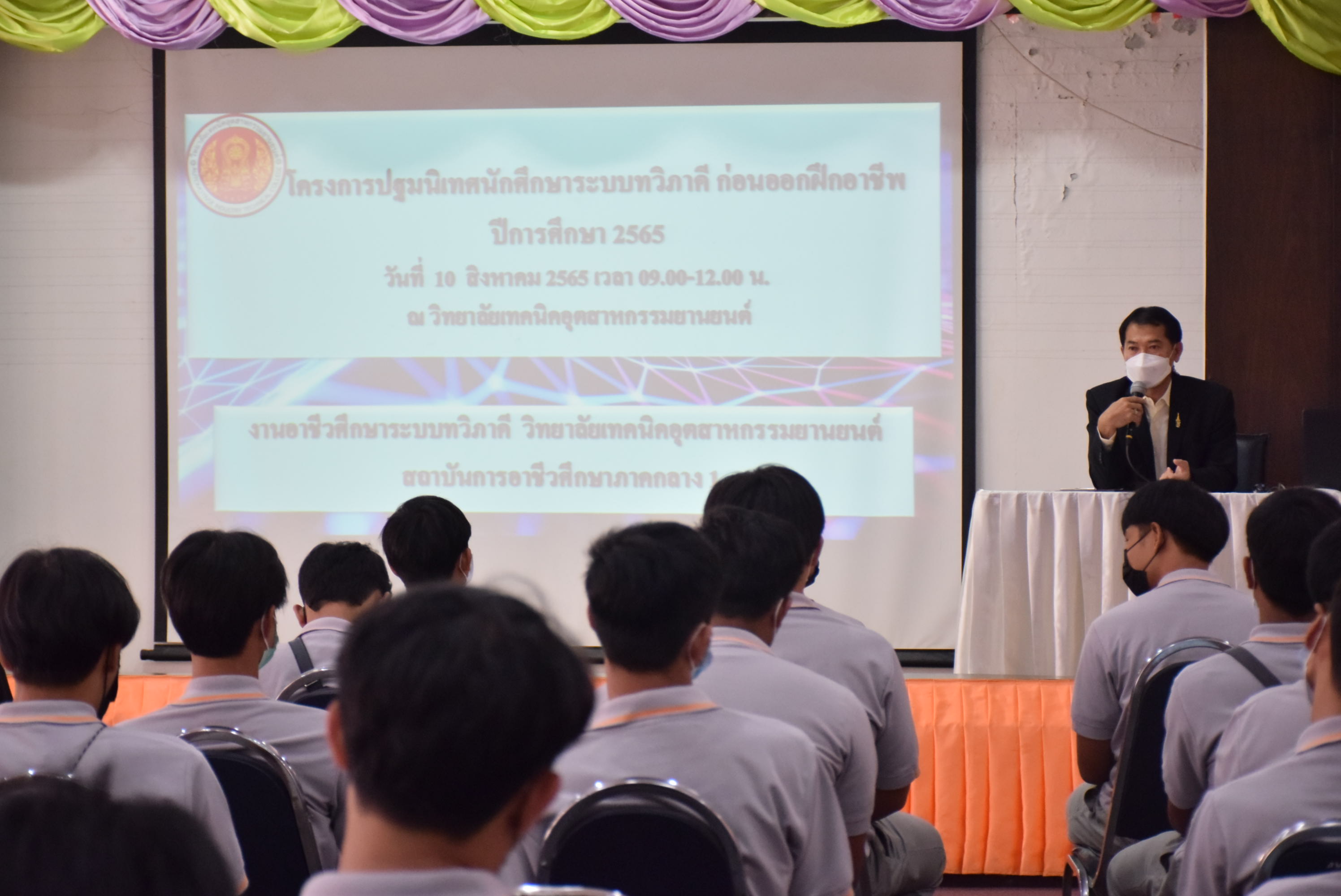 วันที่ 10 สิงหาคม 2565 นายพิเชษฐ์ หาดี ผู้อำนวยการวิทยาลัยเทคนิคอุตสาหกรรมยานยนต์ เป็นประธานกล่าวให้โอวาทแก่นักศึกษาฝึกอาชีพใน โครงการปฐมนิเทศนักศึกษาระบบทวิภาคี ก่อนออกฝึกอาชีพในสถานประกอบการ พร้อมด้วยคณะผู้บริหาร หัวหน้างานหลักสูตร อาจารย์ที่ปรึกษาและเจ้าหน้าที่ ร่วมบรรยายให้คำแนะนำ ความรู้และประสบการณ์ โดยมีนักศึกษาเข้ารับฟังบรรยาย ณ ห้องประชุมยานยนต์1 วิทยาลัยเทคนิคอุตสาหกรรมยานยนต์ ภาพกิจกรรม