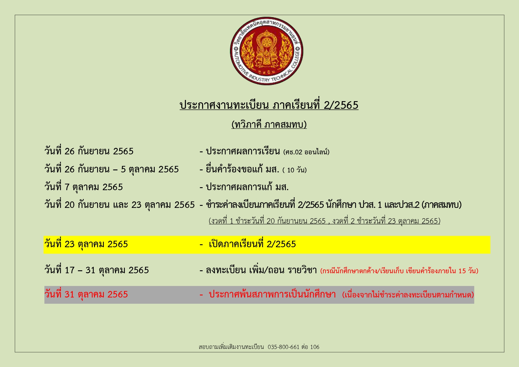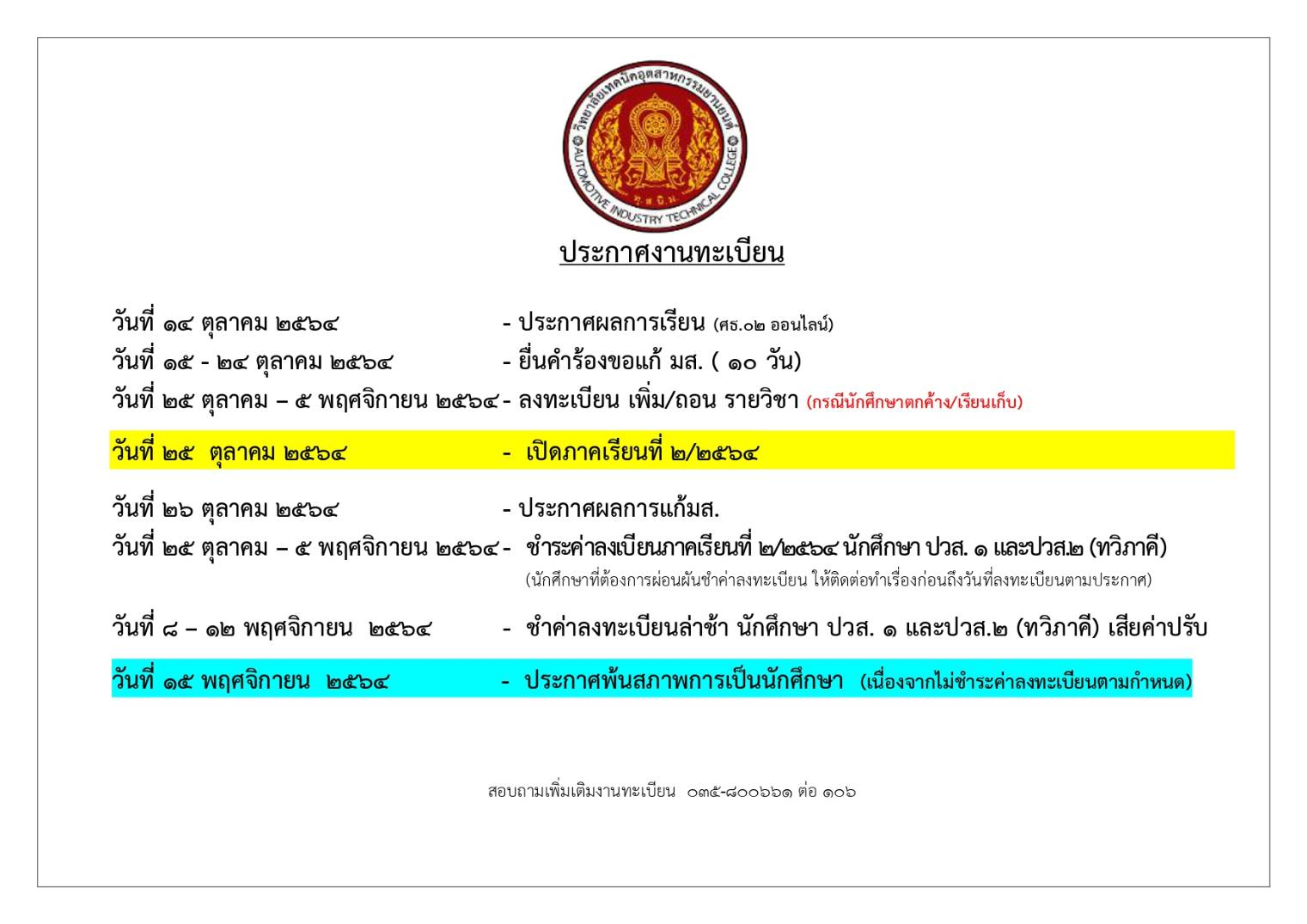 ประกาศงานทะเบียน ปฎิทินกำหนดการ ลงทะเบียน ภาคเรียนที่2/2565(ภาคสมทบ)
