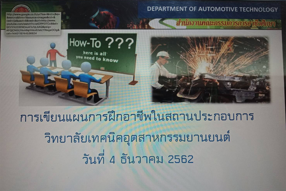 วันที่ 4 ธันวาคม 2562 เวลา 9.00 น. นายวีระชัย สมบัติกำไร ผู้อำนวยการ วิทยาลัยเทคนิคอุตสาหกรรมยานยนต์ เป็นประธานกล่าวเปิดการประชุม การเขียนแผนการฝึกอาชีพในสถานประกอบการ โดยมี ดร.สมชาติ บุญศรี หัวหน้างานหลักสูตรทวิภาคี เป็นผู้กล่าวบรรยายวิธีการเขียนแผน แก่คณะอาจารย์ วิทยาลัยเทคนิคอุตสาหกรรมยานยนต์ ณ ห้องประชุมเล็ก วิทยาลัยเทคนิคอุตสาหกรรมยานยนต์