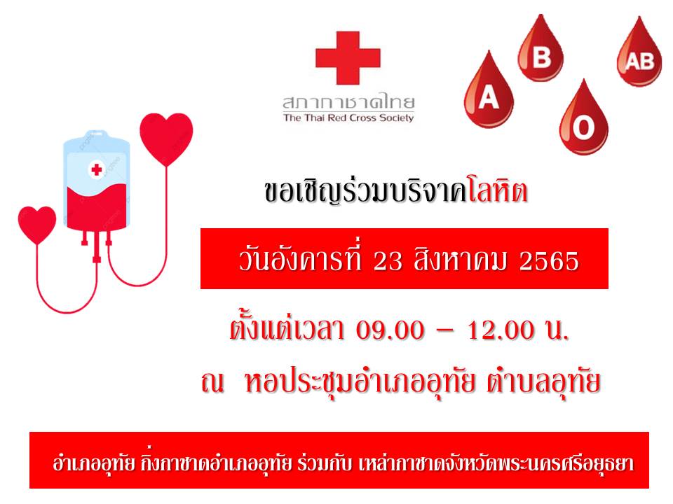 ประชาสัมพันธฺ์เรื่องการรับบริจาคโลหิตในวันที่ 23 สิงหาคม 2565 เวลา 9.00-12.00 น. ณ หอประชุมอำเภออุทัย (ต.อุทัย)