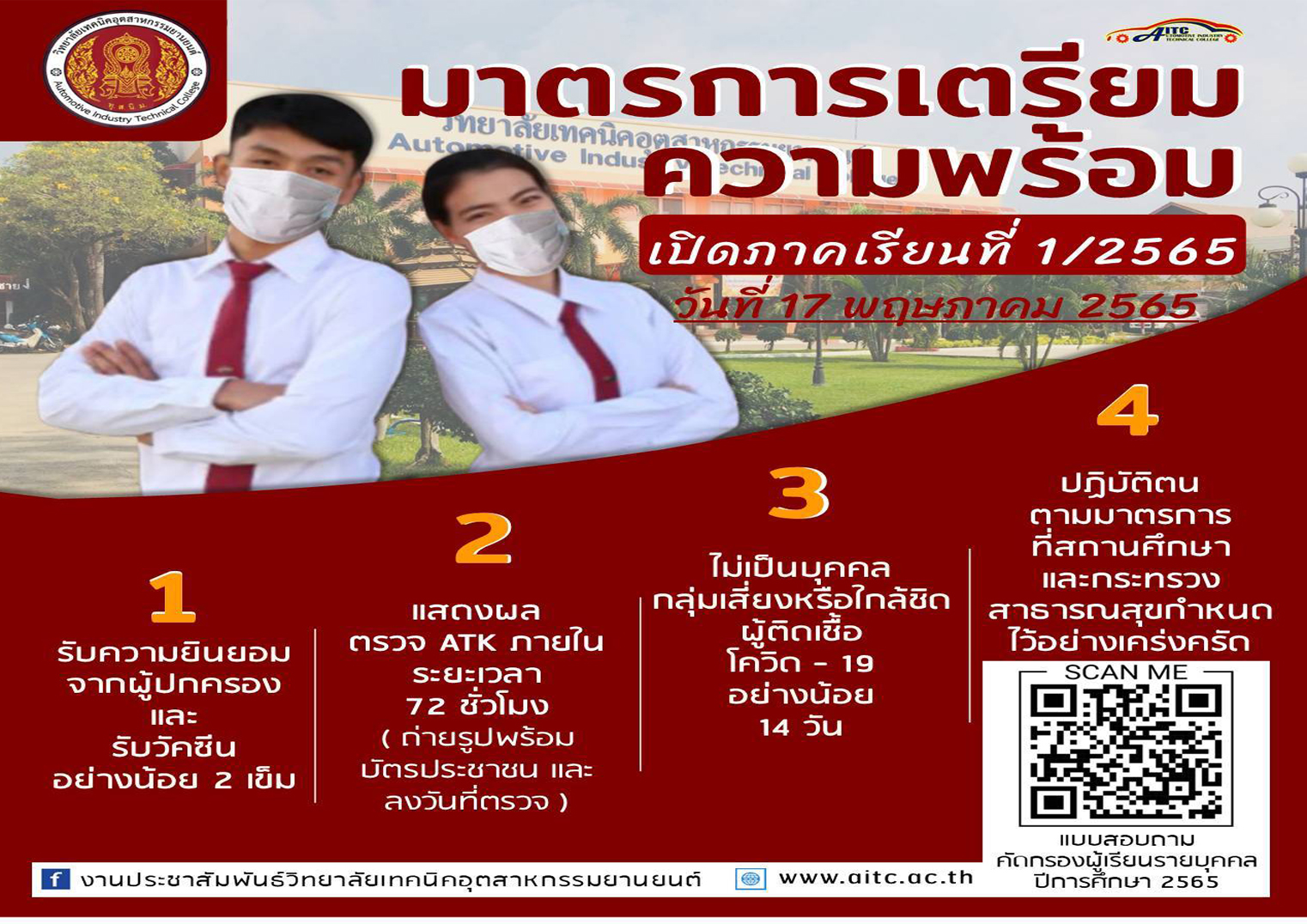วันที่ 17 พฤษภาคม 2565 เปิดเรียน Onsite ภาคเรียนที่ 1/2565 บรรยากาศการเปิดเรียน ภายใต้มาตรการการป้องกัน COVID 19 ณ วิทยาลัยเทคนิคอุตสาหกรรมยานยนต์